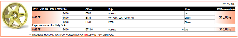 La Speedline 2013C es una reedición de la llanta original que equiparon diversos modelos WRC de Subaru, Toyota, Skoda y Seat. Actualmente esta llanta se fabrica en aluminio con el sistema Flow Formed en medida única 8x18. Ver más abajo ANCLAJES, MEDIDAS y PRECIOS:
