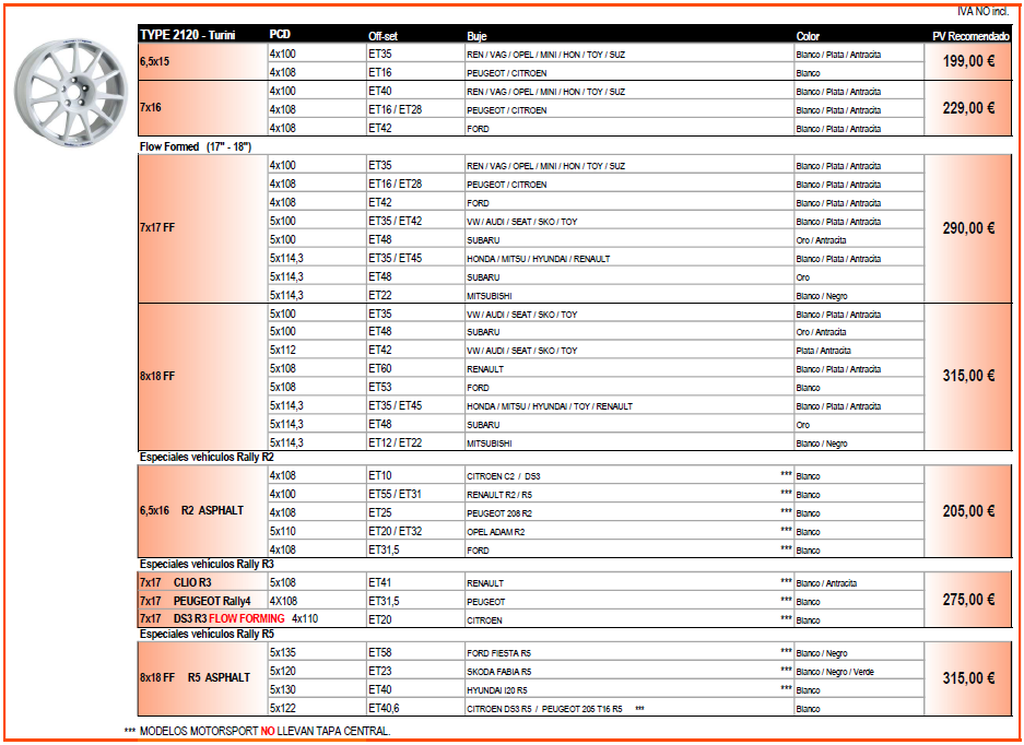 El modelo 2120 Turini es el diseño con más medidas disponibles dentro del catálogo de Speedline. Se fabrica en 15", 16", 17" y 18". Equipa a la mayoría de equipos del Mundial de Rally, FORD FIESTA WRC, R2, R5, SKODA FABIA R5, PEUGEOT 208 R2 y R5, CITROEN DS3 R3, RENAULT TWINGO R2, MITSUBISHI MIRAGE R5… Las medidas 17" y 18" se fabrican mediante el sistema Flow Formed, tecnología que proporciona a la vez ligereza, dureza y resistencia. A su vez, también equipa a los fabricantes más prestigiosos como Lamborghini, Ferrari, Aston Martin... Ver más abajo ANCLAJES, MEDIDAS y PRECIOS:
