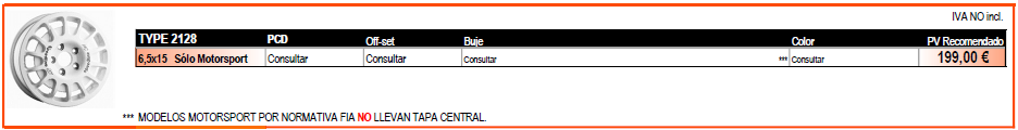 La Speedline 2128 es una llanta creada para rally de tierra, con un único diámetro de 15". Su plato de refuerzo la hace extraordinariamente resistente a la vez que protege los frenos del vehículo. Tiene unos anclajes específicos para Subaru, Mitsubishi y VAG. Importante, este modelo de llanta sólo está disponible ocasionalmente y bajo pedido. Por favor consultar disponibilidad. Ver más abajo ANCLAJES, MEDIDAS y PRECIOS:
